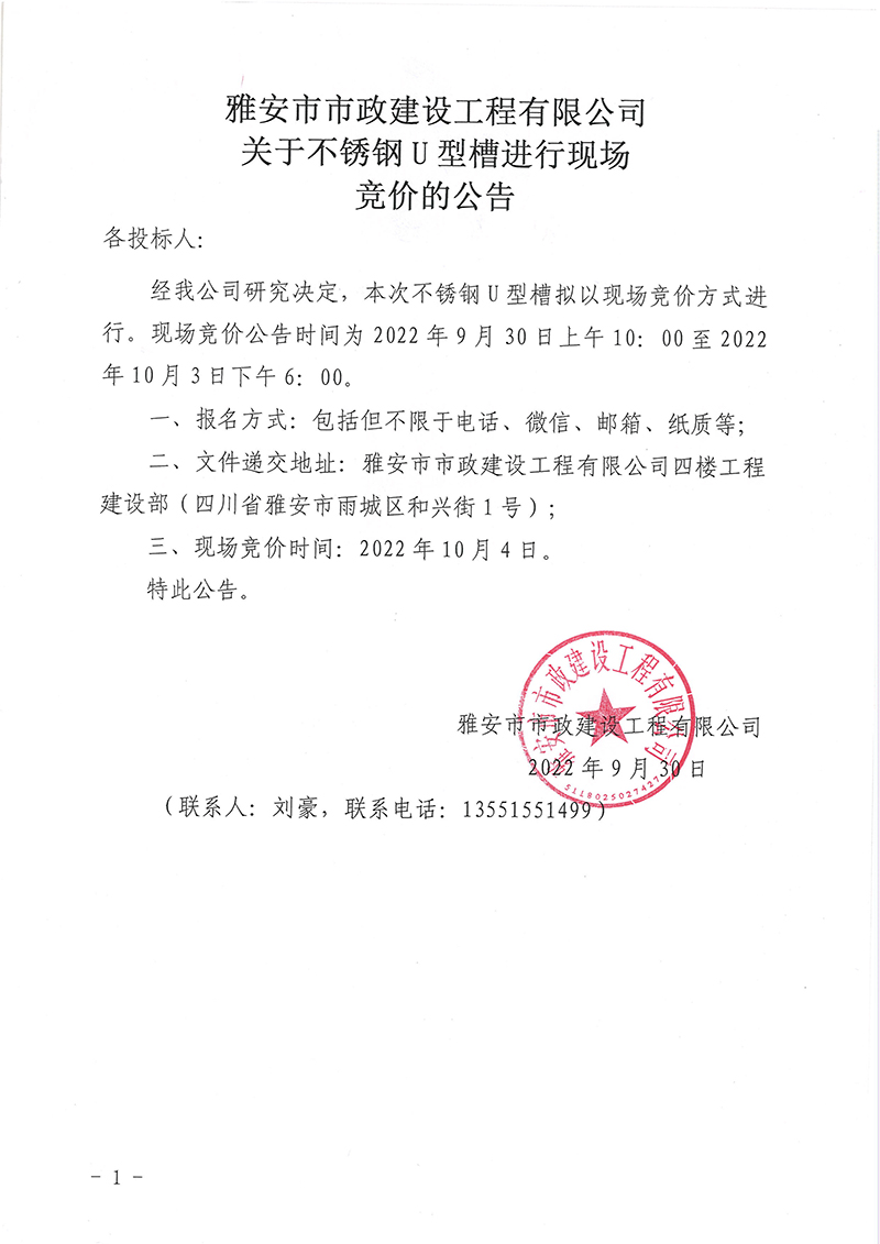 關(guān)于不銹鋼U型槽進(jìn)行現(xiàn)場(chǎng)競(jìng)價(jià)的公告