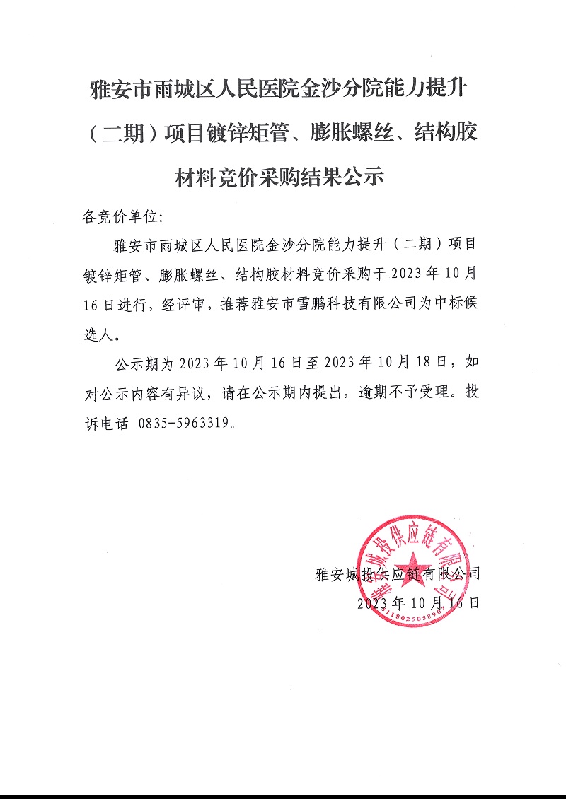 雅安市雨城區(qū)人民醫(yī)院金沙分院能力提升(二期)項目鍍鋅矩管、膨脹螺絲、結(jié)構膠材料競價采購結(jié)果公示