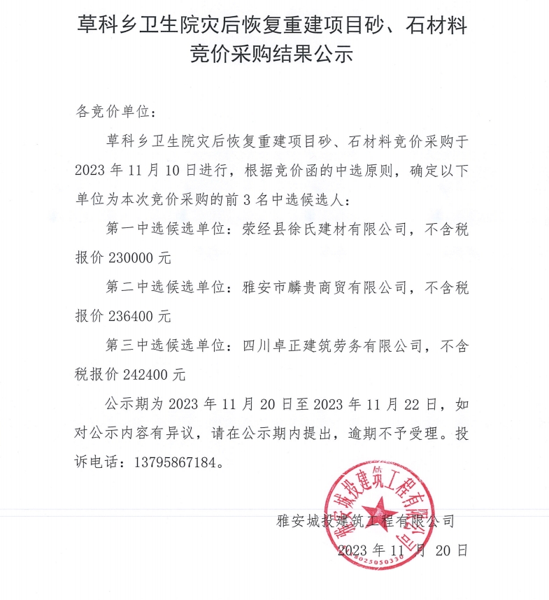 草科鄉(xiāng)衛(wèi)生院災后恢復重建項目砂、石材料競價采購結果公示