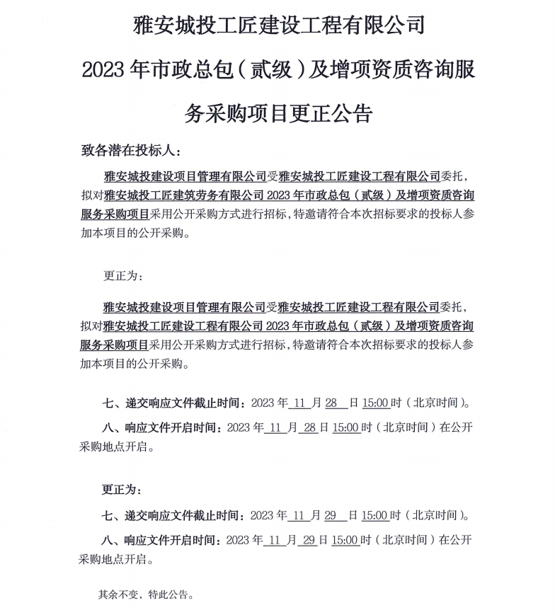 雅安城投工匠建設(shè)工程有限公司2023年市政總包(貳級(jí))及增項(xiàng)資質(zhì)咨詢服務(wù)采購項(xiàng)目更正公告