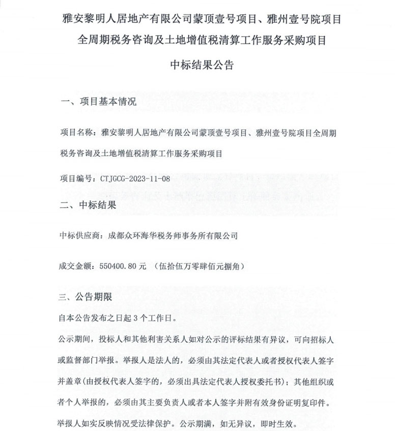 雅安黎明人居地產(chǎn)有限公司蒙頂壹號項目、雅州壹號院項目全周期稅務(wù)咨詢及土地增值稅清算工作服務(wù)采購項目中標(biāo)結(jié)果公告