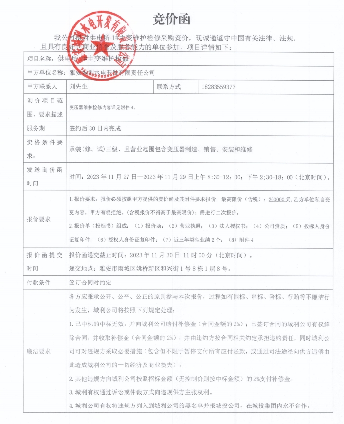 供電所1#主變維護(hù)檢修競(jìng)價(jià)公告