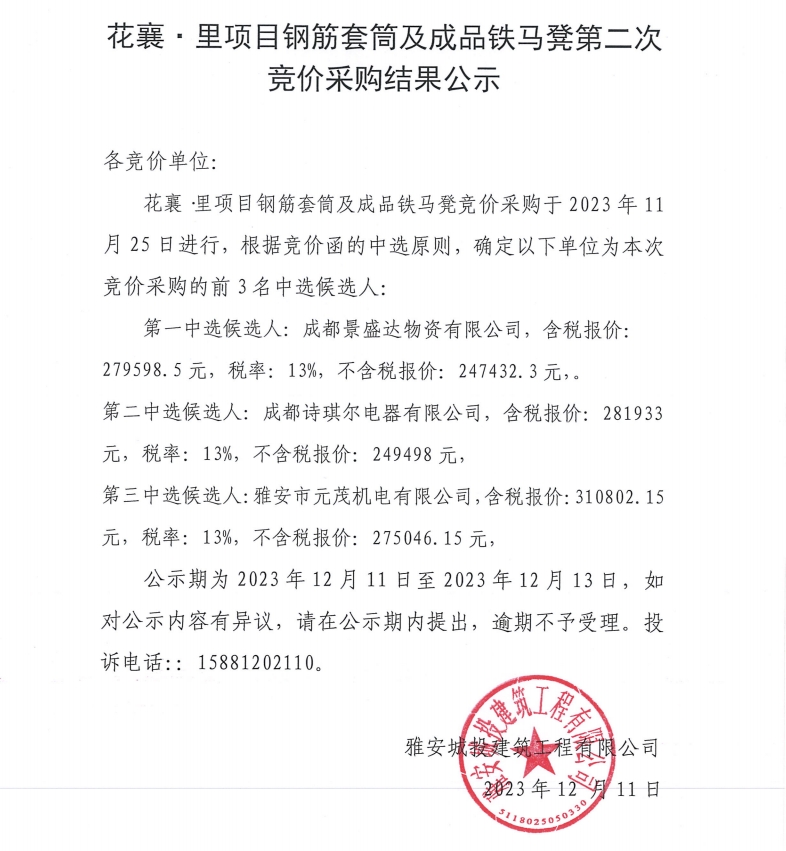 花襄·里項目鋼筋套筒及成品鐵馬凳第二次競價采購結果公示