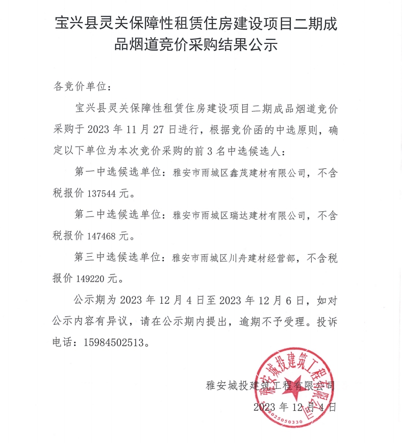 寶興縣靈關(guān)保障性租賃住房建設(shè)項目二期成品煙道競價采購結(jié)果公示