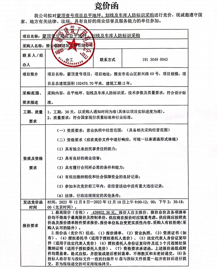 蒙頂壹號(hào)項(xiàng)目總平地坪、劃線(xiàn)及車(chē)庫(kù)人防標(biāo)識(shí)采購(gòu)競(jìng)價(jià)公告