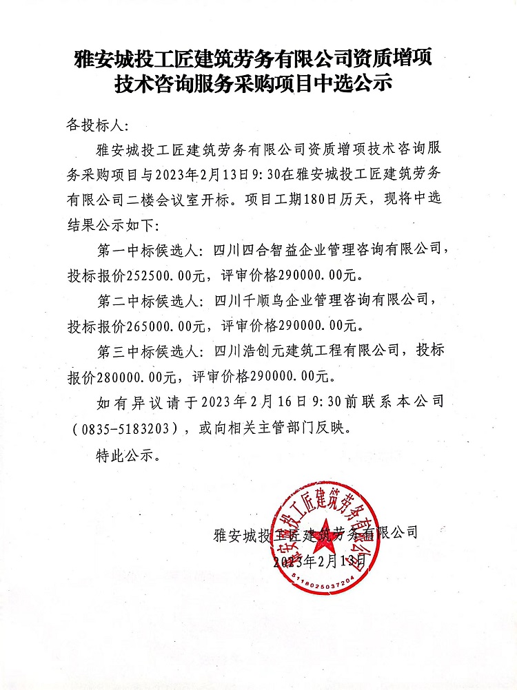 雅安城投工匠建筑勞務(wù)有限公司資質(zhì)增項技術(shù)咨詢服務(wù)采購項目中選公示