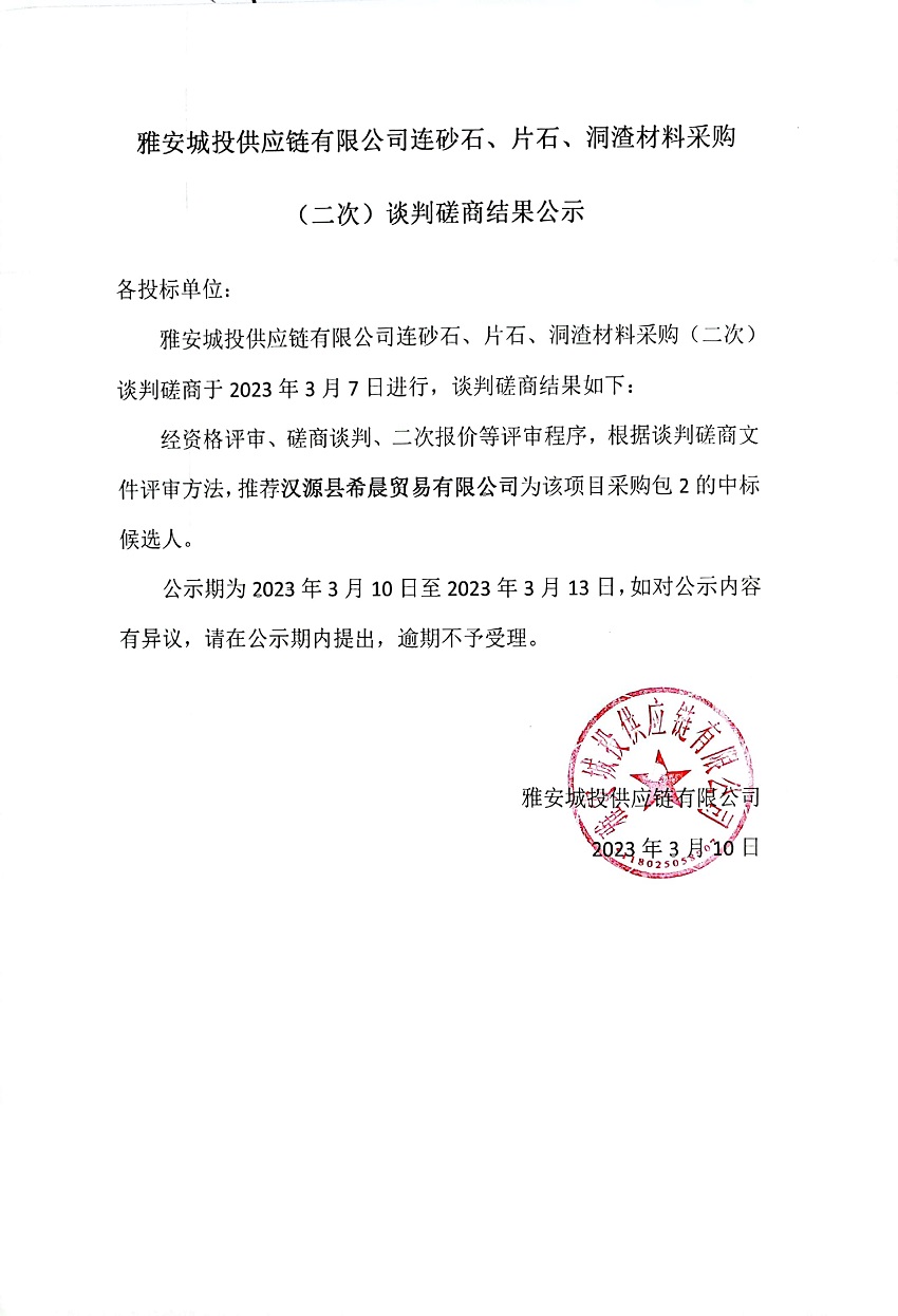 雅安城投供應(yīng)鏈有限公司連砂石、片石、洞渣材料采購(gòu)(二次)談判磋商結(jié)果公示