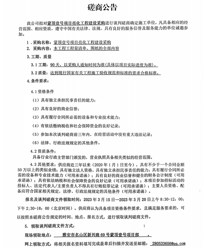 蒙頂壹號項目亮化工程建設采購磋商公告