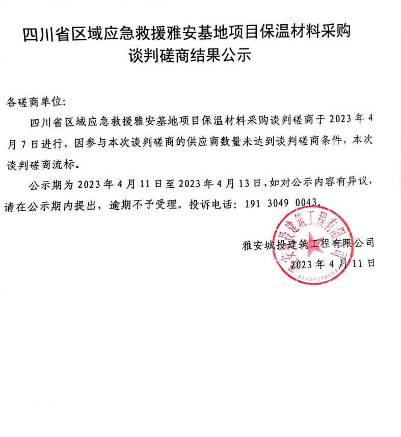 四川省區(qū)域應急救援雅安基地項目保溫材料采購談判磋商結果公示