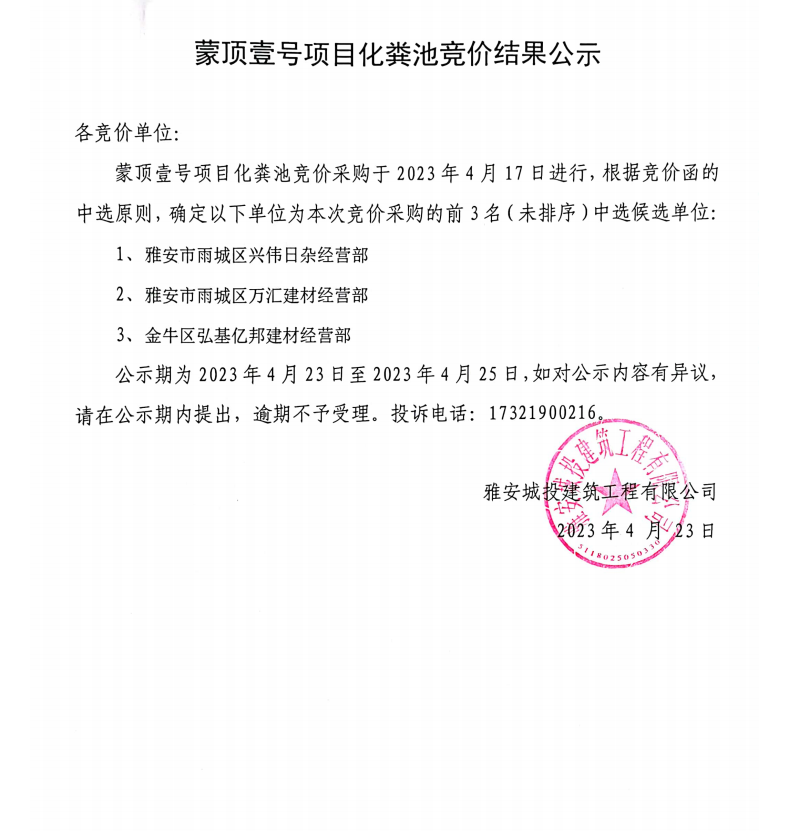 蒙頂壹號項目化糞池競價結(jié)果公示