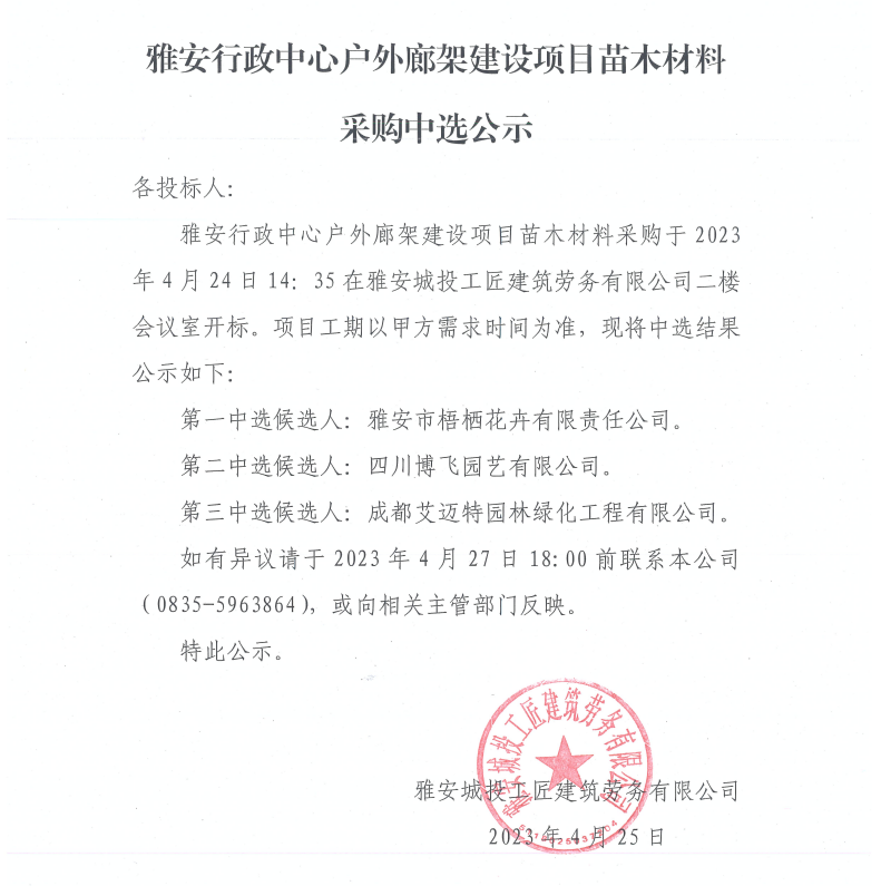 雅安行政中心戶外廊架建設(shè)項目苗木材料采購中選公示