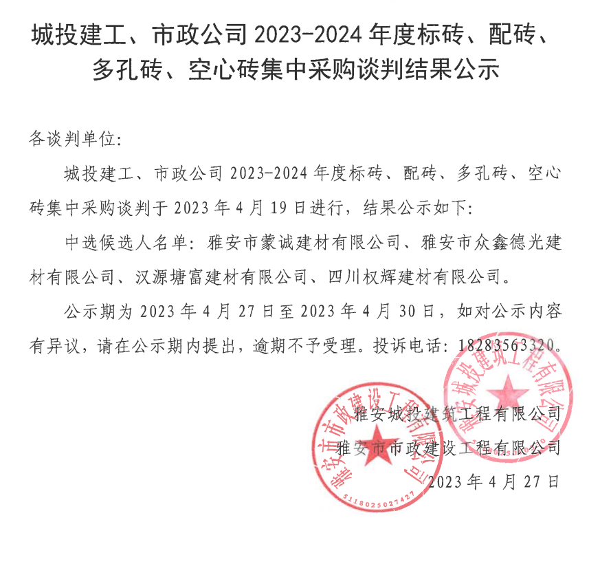 城投建工、市政公司2023-2024年度標(biāo)磚、配磚、多孔磚、空心磚集中采購談判結(jié)果公示