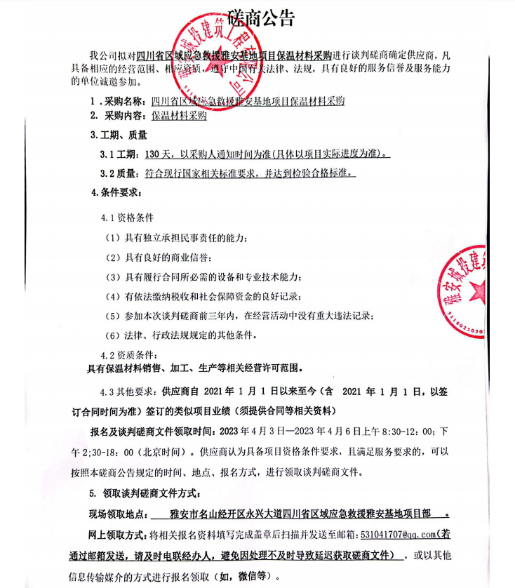 四川省區(qū)域應(yīng)急救援雅安基地項(xiàng)目保溫材料采購談判磋商公告