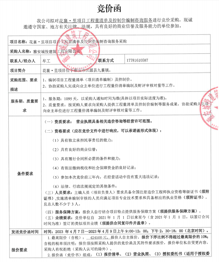 花襄·里項目工程量清單及招標(biāo)控制價編制咨詢服務(wù)采購競價公告