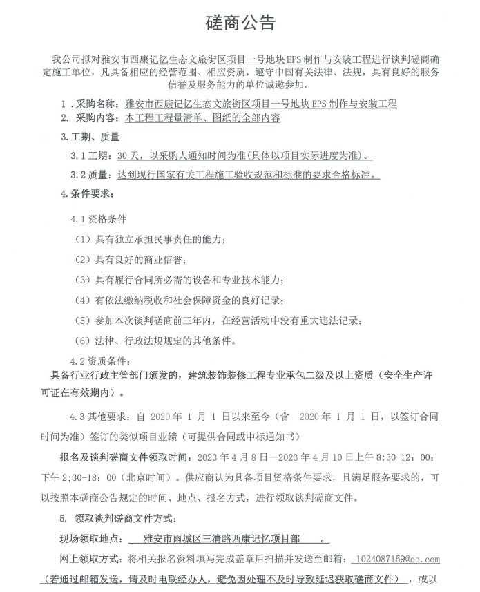 雅安市西康記憶生態(tài)文旅街區(qū)項(xiàng)目一號(hào)地塊項(xiàng)目EPS制作與安裝工程采購談判磋商公告