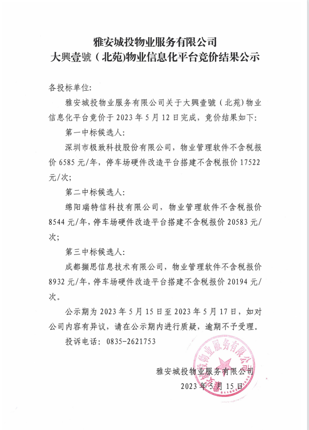 大興壹號(hào)(北苑)物業(yè)信息化平臺(tái)競(jìng)價(jià)結(jié)果公示