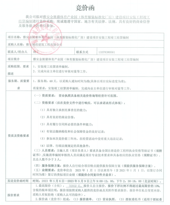 雅安金熊貓?bào)w育產(chǎn)業(yè)園(體育服裝標(biāo)準(zhǔn)化廠房)建設(shè)項(xiàng)目安裝工程竣工結(jié)算編制競(jìng)價(jià)公告