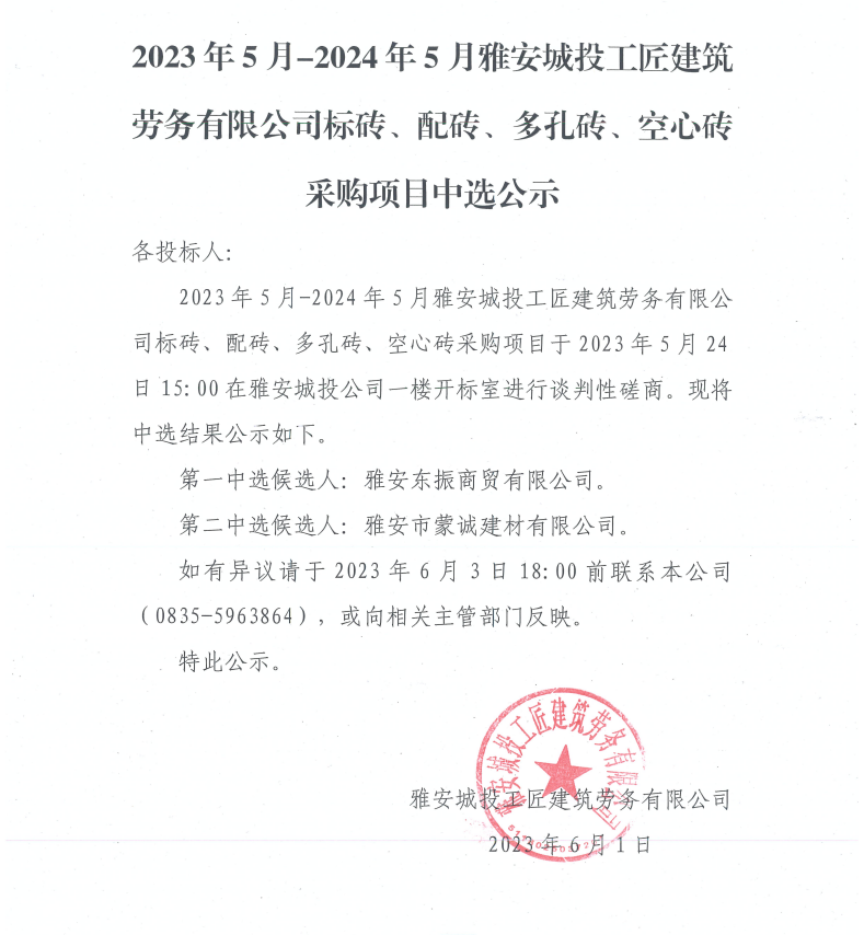 2023年5月-2024年5月雅安城投工匠建筑勞務(wù)有限公司標(biāo)磚、配磚、多孔磚、空心磚采購項目中選公示