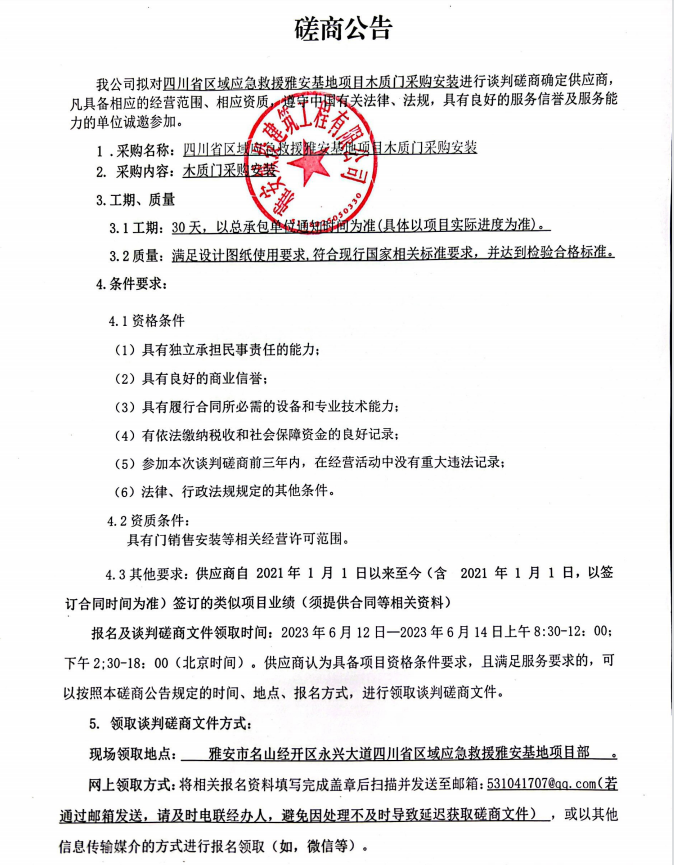 四川省區(qū)域應(yīng)急救援雅安基地項目木質(zhì)門采購安裝談判磋商公告