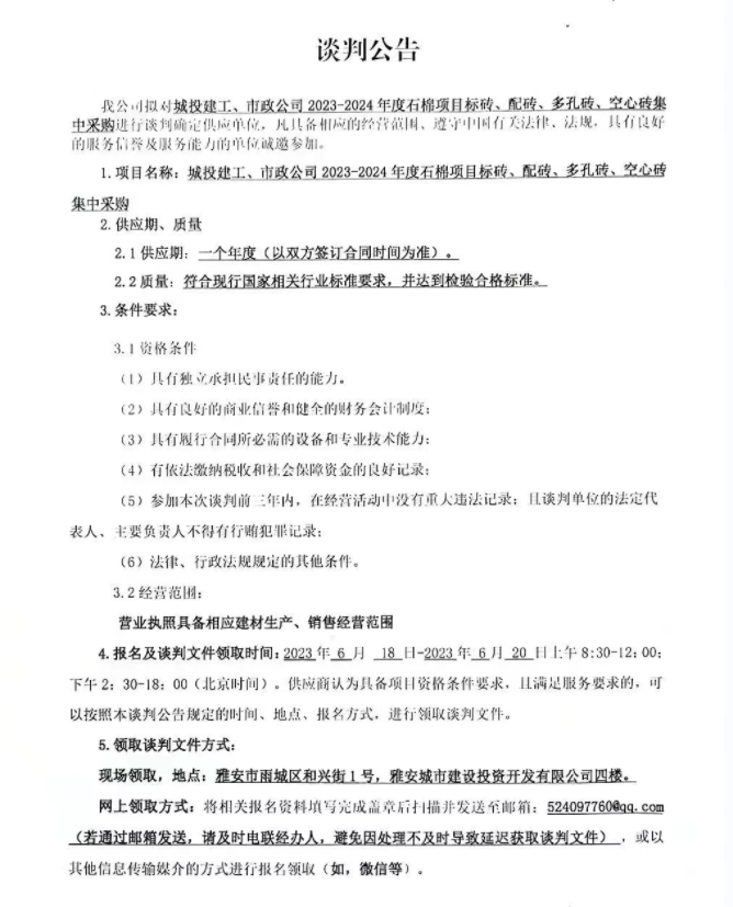 城投建工、市政公司2023-2024年度石棉項目標磚、配磚、多孔磚、空心磚集中采購談判公告