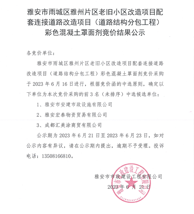 雅安市雨城區(qū)雅州片區(qū)老舊小區(qū)改造項(xiàng)目配套連接道路改造項(xiàng)目(道路結(jié)構(gòu)專(zhuān)業(yè)分包工程)彩色混凝土罩面劑競(jìng)價(jià)結(jié)果公示