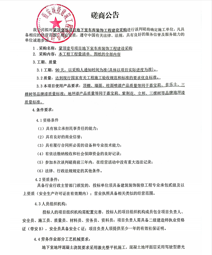 蒙頂壹號項目地下室車庫裝飾工程建設采購談判磋商公告