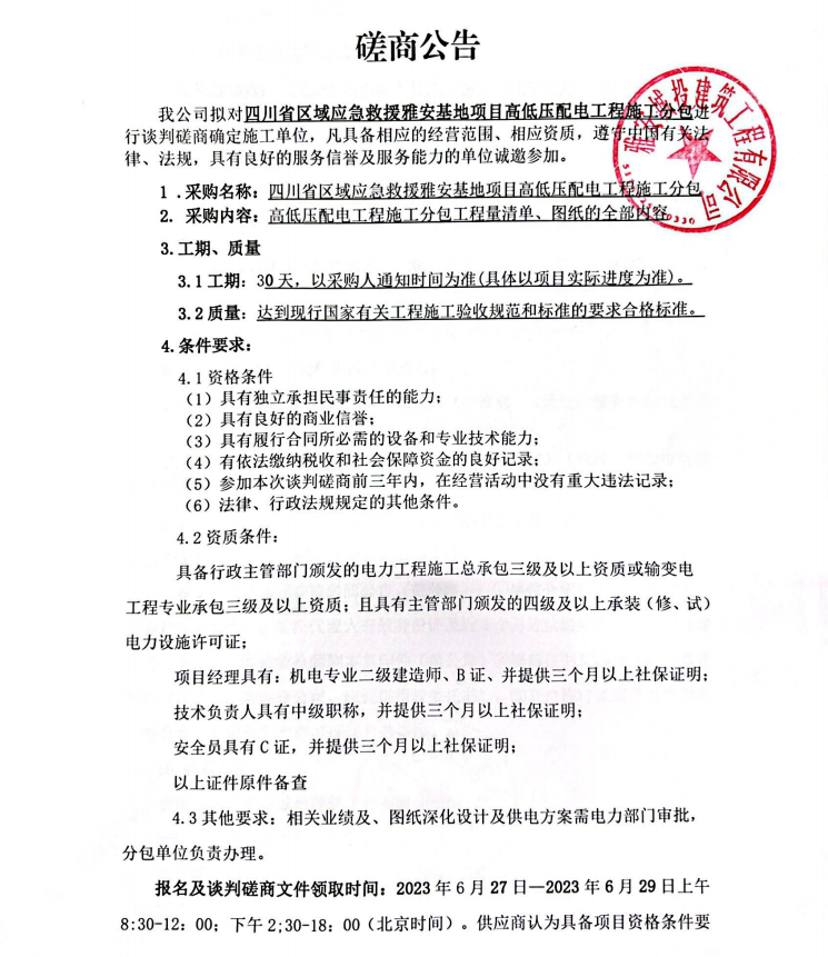 四川省區(qū)域應(yīng)急救援雅安基地項(xiàng)目高低壓配電工程施工分包談判磋商公告