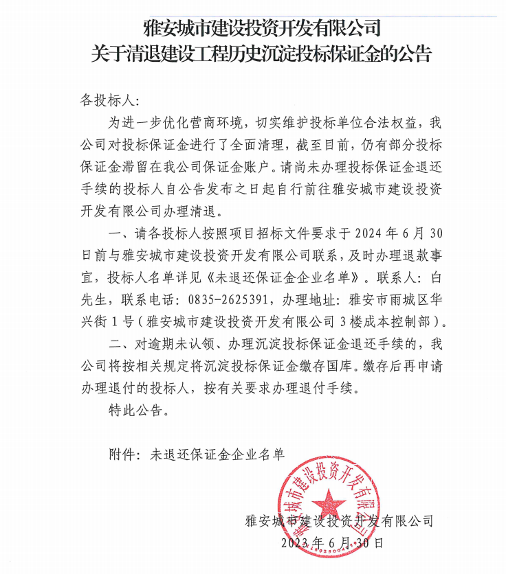 雅安城市建設(shè)投資開發(fā)有限公司關(guān)于清退建設(shè)工程歷史沉淀投標(biāo)保證金的公告