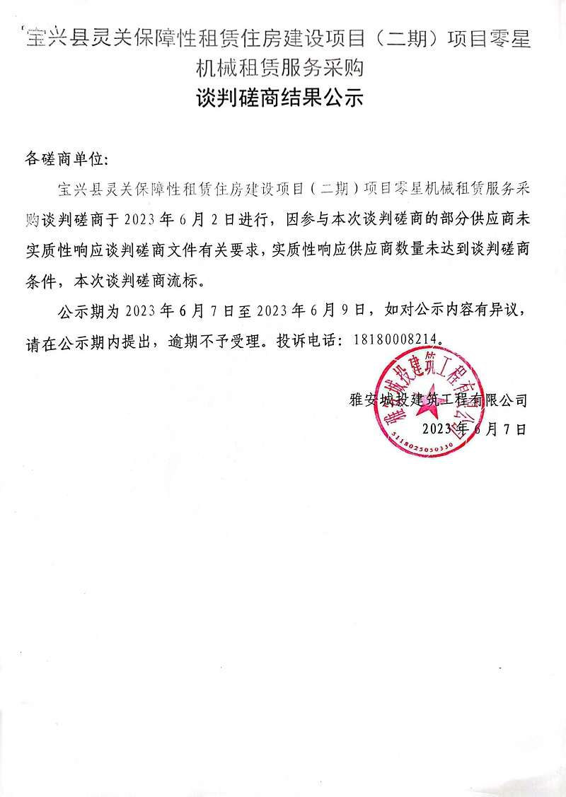 寶興縣靈關(guān)保障性租賃住房建設(shè)項(xiàng)目(二期)項(xiàng)目零星機(jī)械租賃服務(wù)采購(gòu)談判磋商結(jié)果公示