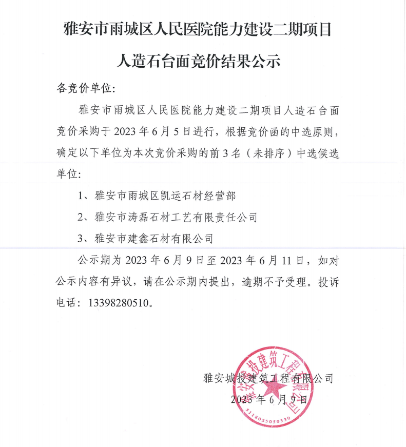 雅安市雨城區(qū)人民醫(yī)院能力建設(shè)二期項(xiàng)目人造石臺面競價結(jié)果公示