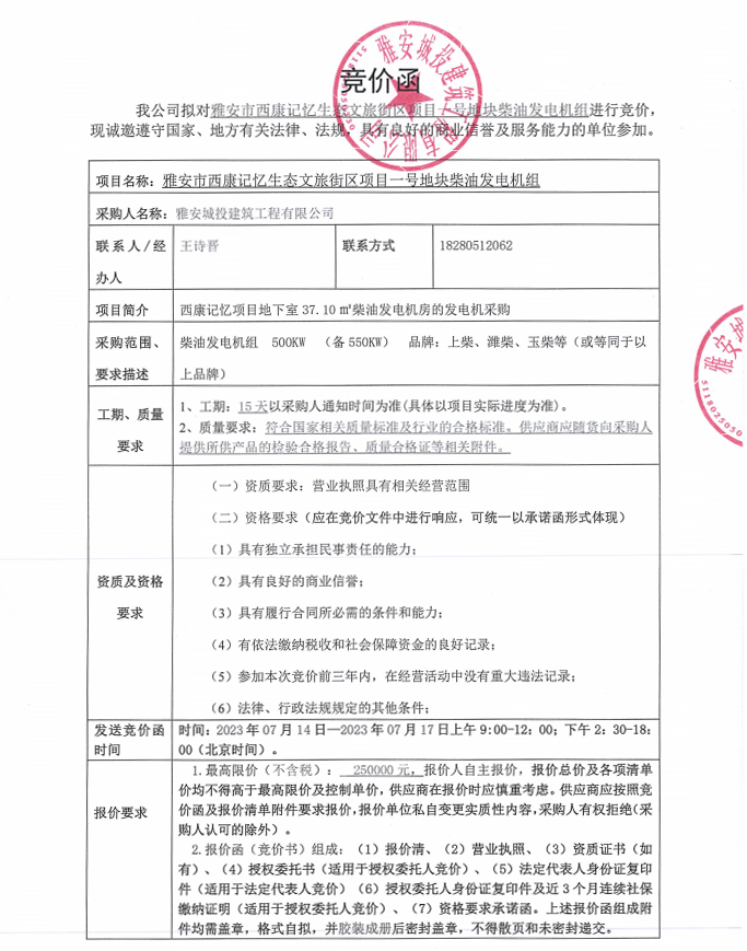 雅安市西康記憶生態(tài)文旅街區(qū)項(xiàng)目一號(hào)地塊柴油發(fā)電機(jī)組競(jìng)價(jià)采購公告