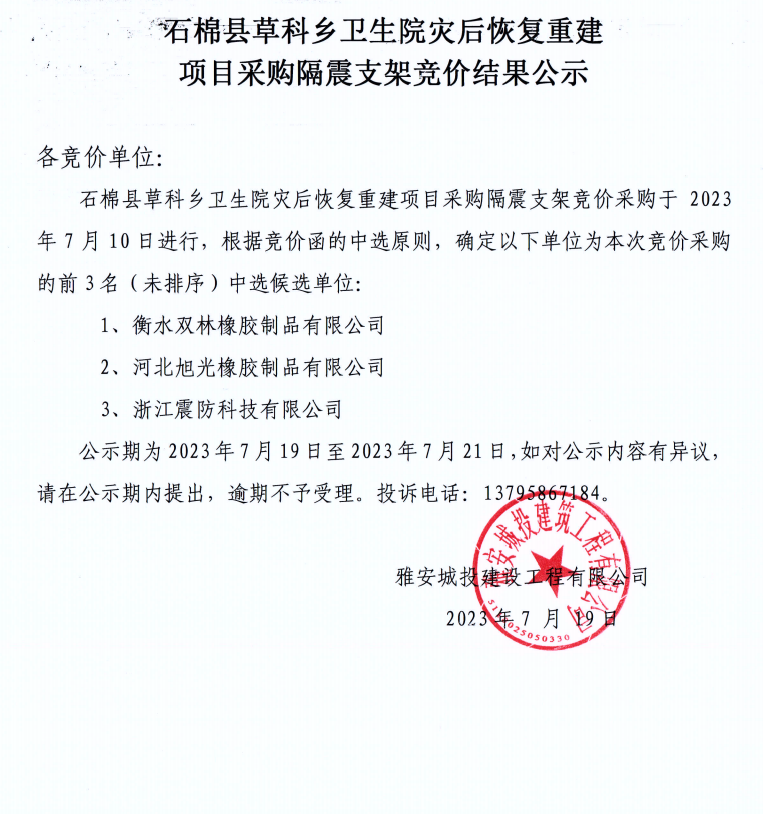 石棉縣草科鄉(xiāng)衛(wèi)生院災后恢復重建項目采購隔震支架競價結(jié)果公示