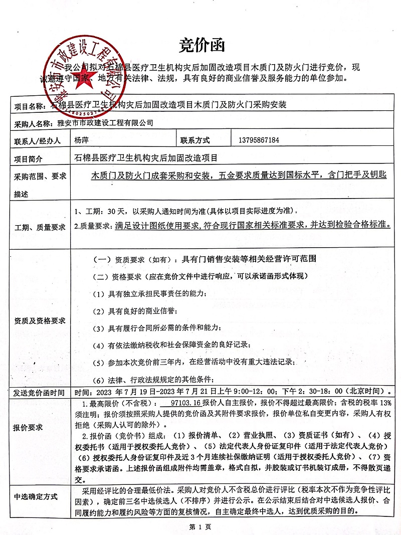 石棉縣醫(yī)療衛(wèi)生機構(gòu)災后加固改造項目木質(zhì)門及防火門采購安裝競價公告