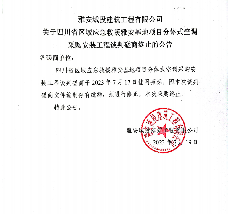 雅安城投建筑工程有限公司關于四川省區(qū)域應急救援雅安基地項目分體式空調(diào)采購安裝工程談判磋商終止的公告
