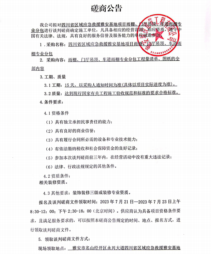 四川省區(qū)域應(yīng)急救援雅安基地項(xiàng)目雨棚、門廳吊頂、車道雨棚專業(yè)分包談判磋商公告