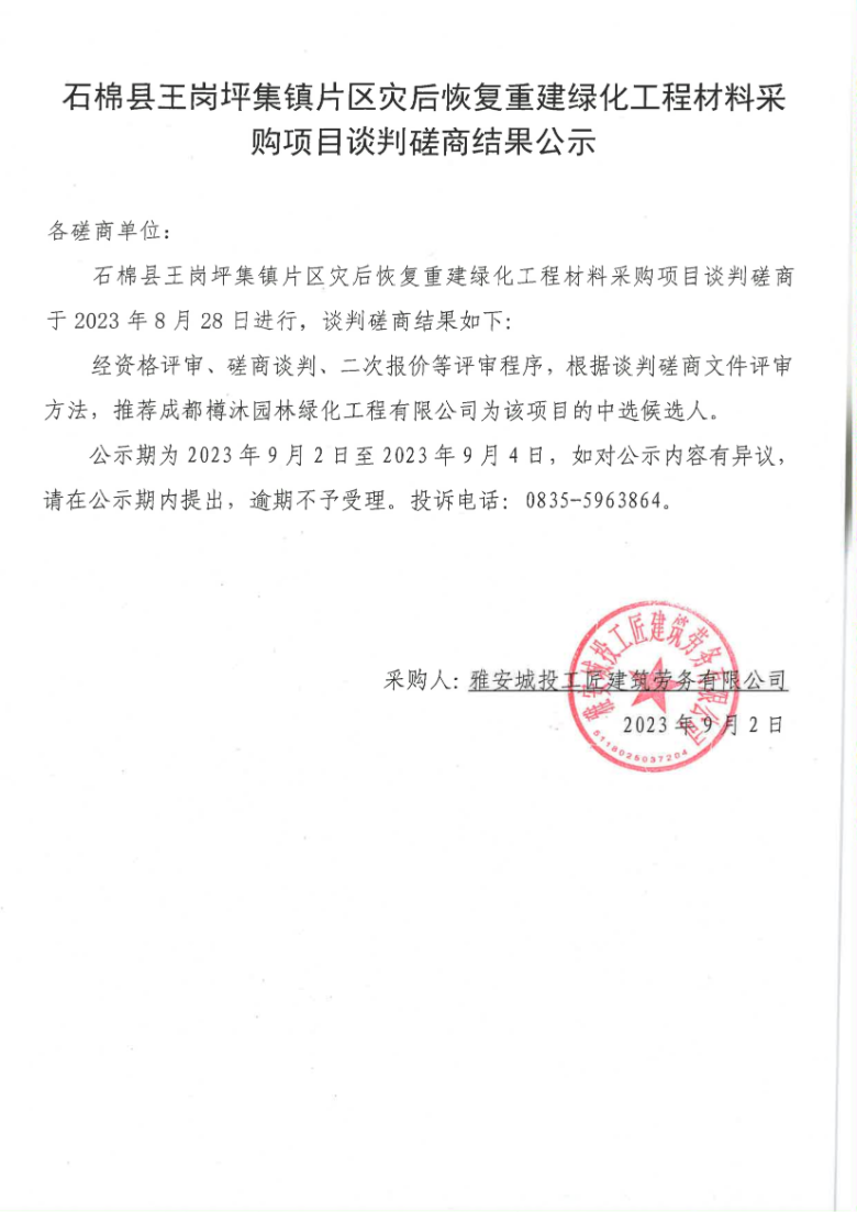 石棉縣王崗坪集鎮(zhèn)片區(qū)災后恢復重建綠化工程材料采購項目談判磋商結果公示
