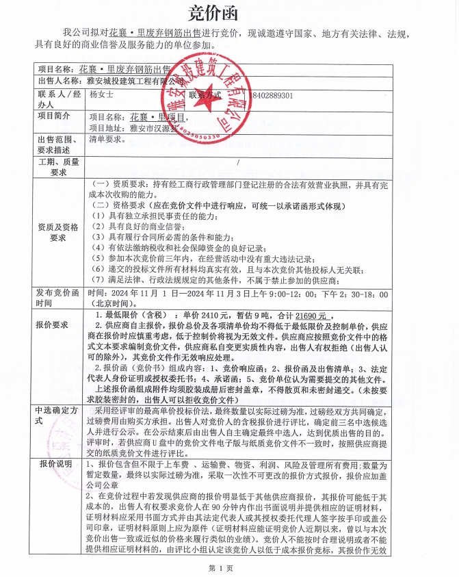 花襄·里廢棄鋼筋出售競價公告