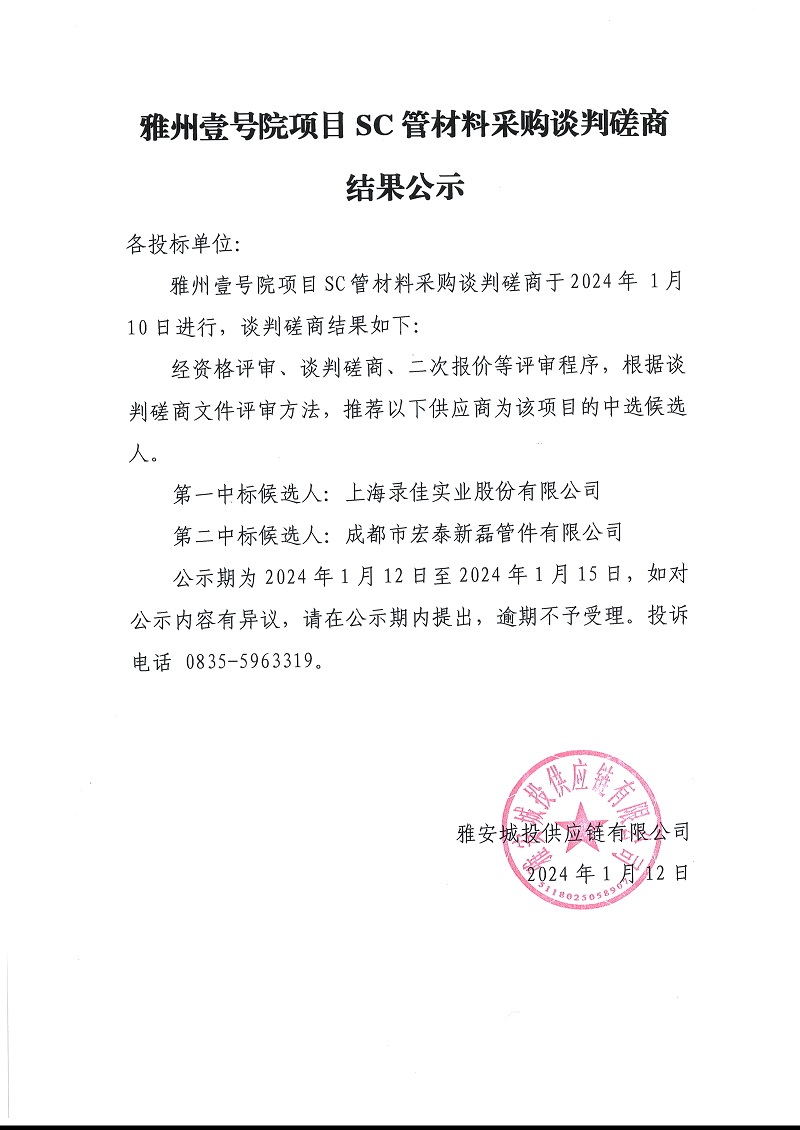 雅州壹號(hào)院項(xiàng)目SC管材料采購談判磋商結(jié)果公示