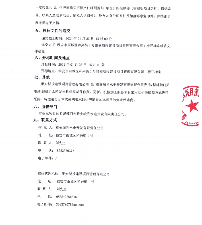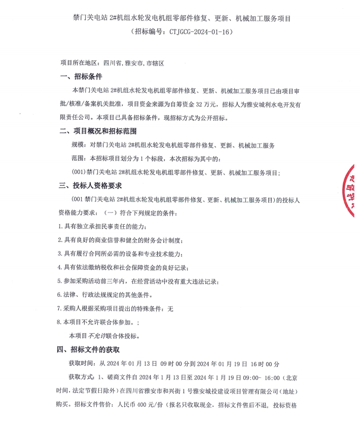 禁門關(guān)電站2#機組水輪發(fā)電機組零部件修復(fù)、更新、機械加工服務(wù)項目公告