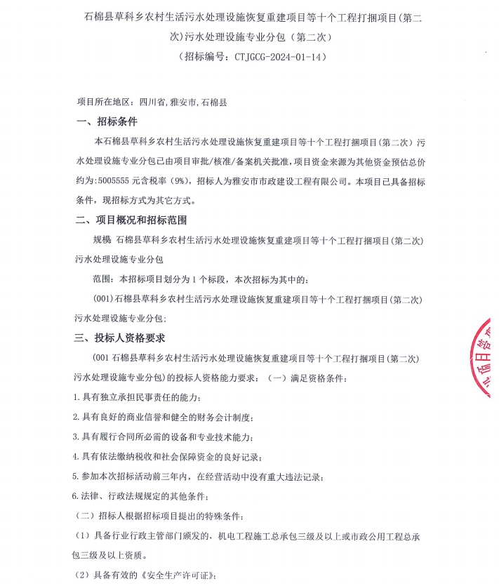 石棉縣草科鄉(xiāng)農(nóng)村生活污水處理設(shè)施恢復(fù)重建項目等十個工程打捆項目(第二次)污水處理設(shè)施專業(yè)分包競價公告