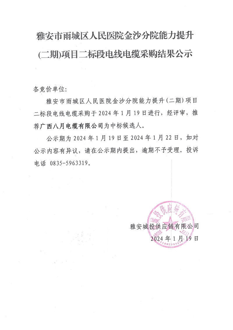 雅安市雨城區(qū)人民醫(yī)院金沙分院能力提升(二期)項(xiàng)目二標(biāo)段電線電纜采購結(jié)果公示