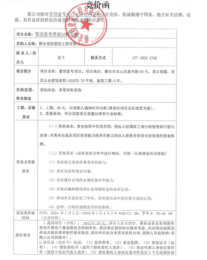 蒙頂壹號(hào)零星材料采購(gòu)競(jìng)價(jià)公告