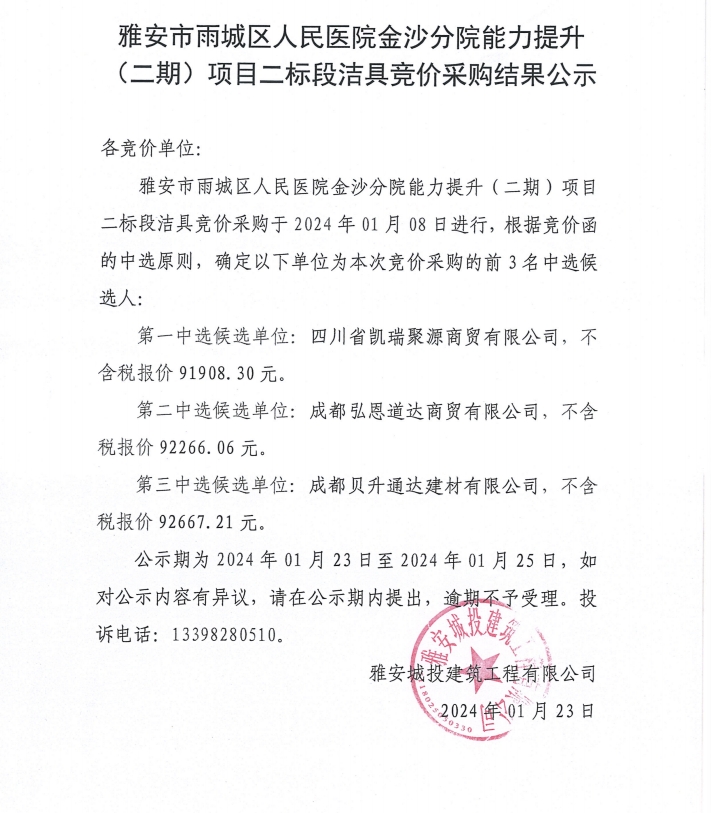 雅安市雨城區(qū)人民醫(yī)院金沙分院能力提升(二期)項(xiàng)目二標(biāo)段潔具競(jìng)價(jià)采購結(jié)果公示