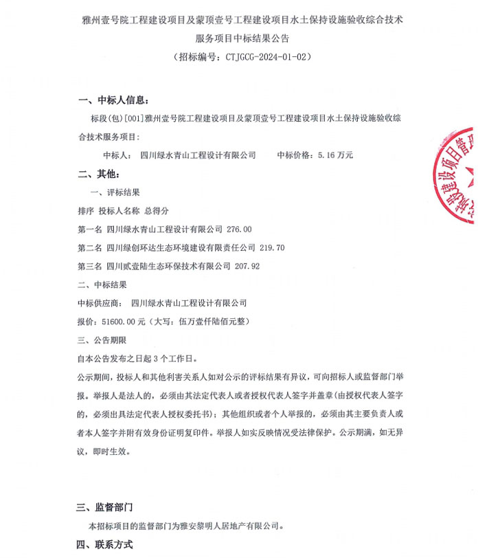 雅州壹號院工程建設(shè)項(xiàng)目及蒙頂壹號工程建設(shè)項(xiàng)目水土保持設(shè)施驗(yàn)收綜合技術(shù)服務(wù)項(xiàng)目中標(biāo)結(jié)果公告
