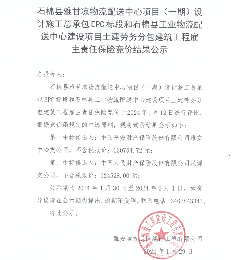石棉縣雅甘涼物流配送中心項目(一期)設(shè)計施工總承包EPC標段和石棉縣工業(yè)物流配送中心建設(shè)項目土建勞務(wù)分包建筑工程雇主責任保險競價結(jié)果公示