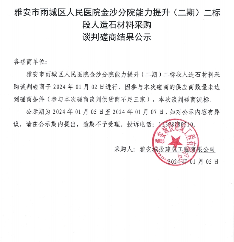 雅安市雨城區(qū)人民醫(yī)院金沙分院能力提升(二期)二標段人造石材材料采購談判磋商結果公示
