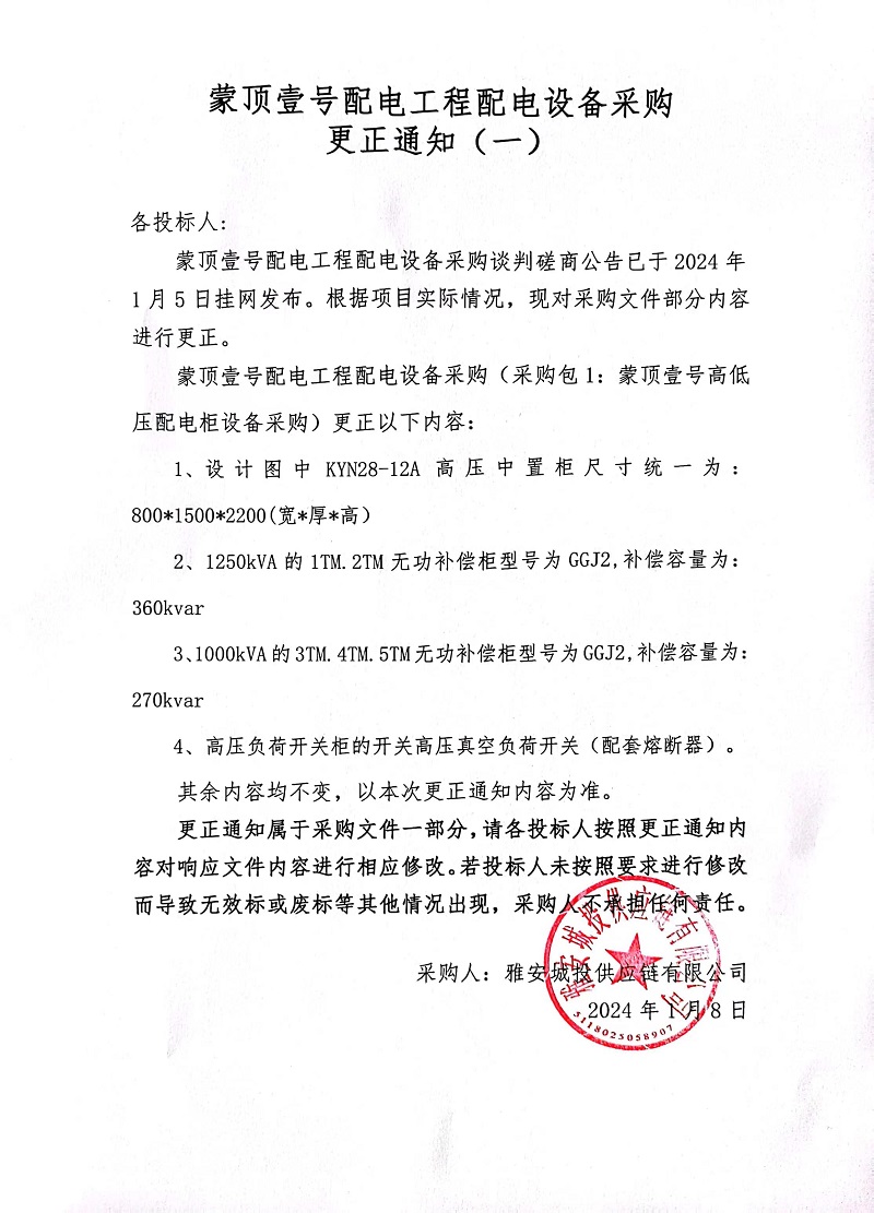 蒙頂壹號配電工程配電設(shè)備采購更正通知(一)