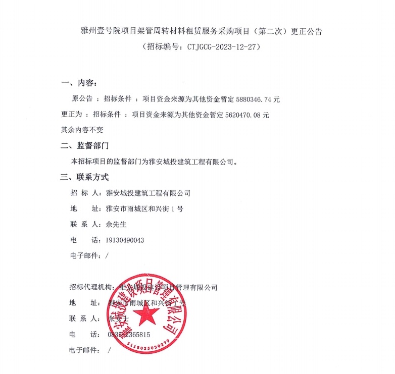 雅州壹號(hào)院項(xiàng)目架管周轉(zhuǎn)材料租賃服務(wù)采購(gòu)項(xiàng)目(第二次)更正公告