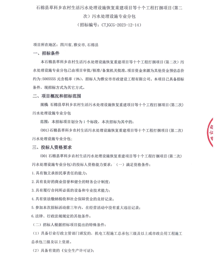 石棉縣草科鄉(xiāng)農(nóng)村生活污水處理設(shè)施恢復(fù)重建項目等十個工程打捆項目(第二次)污水處理設(shè)施專業(yè)分包采購公告