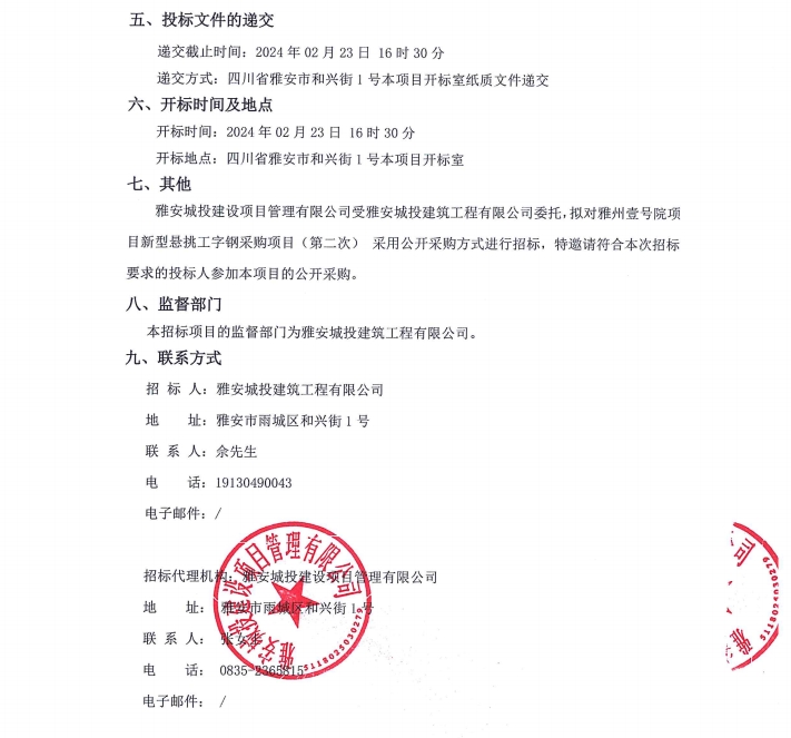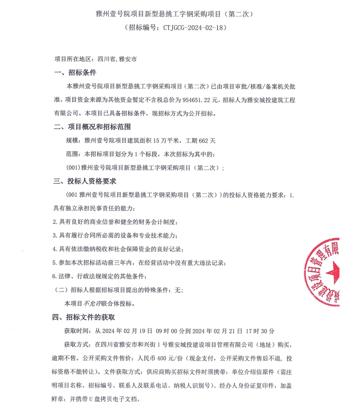 雅州壹號(hào)院項(xiàng)目新型懸挑工字鋼采購項(xiàng)目(第二次)公告